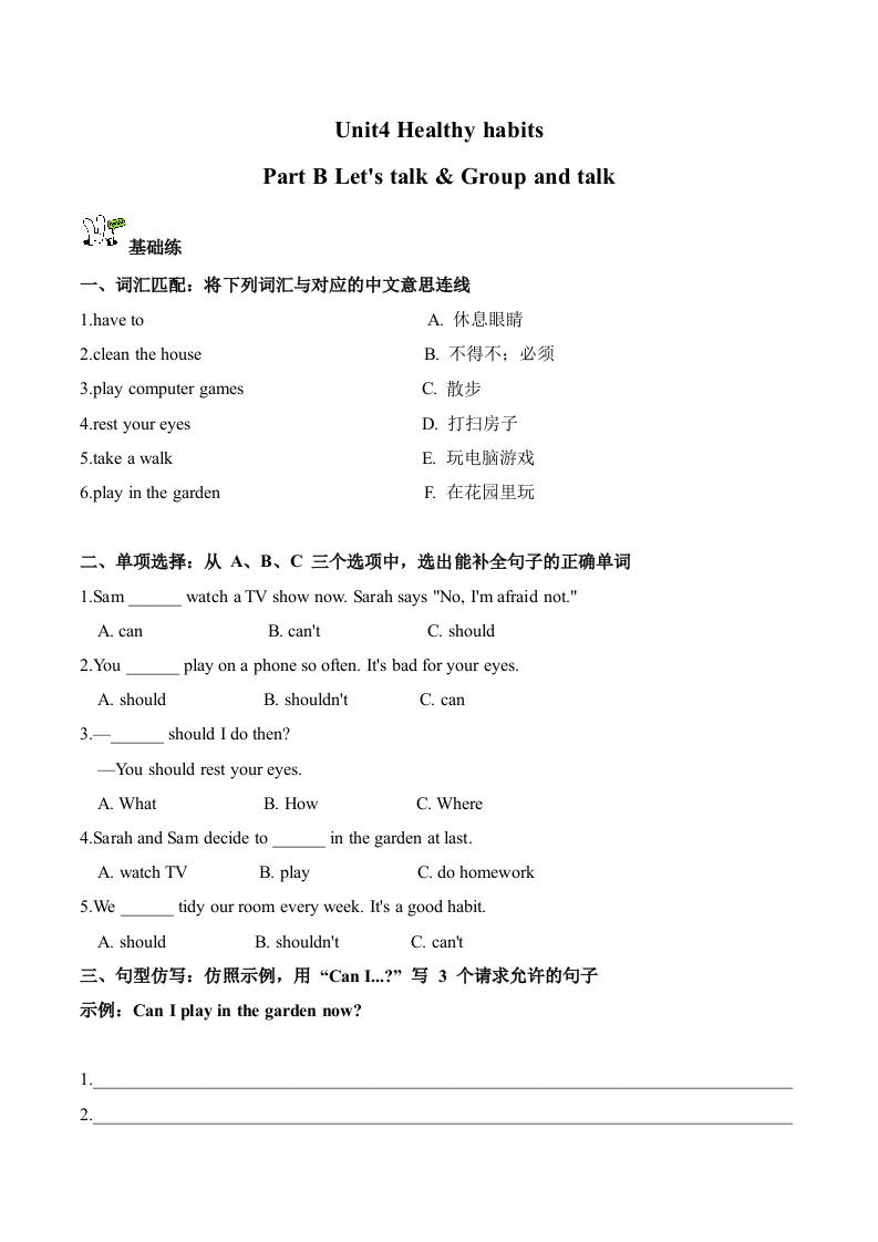 Unit 4 第4课时 Part B Let's talk & Group and talk(分层作业) (新教材)