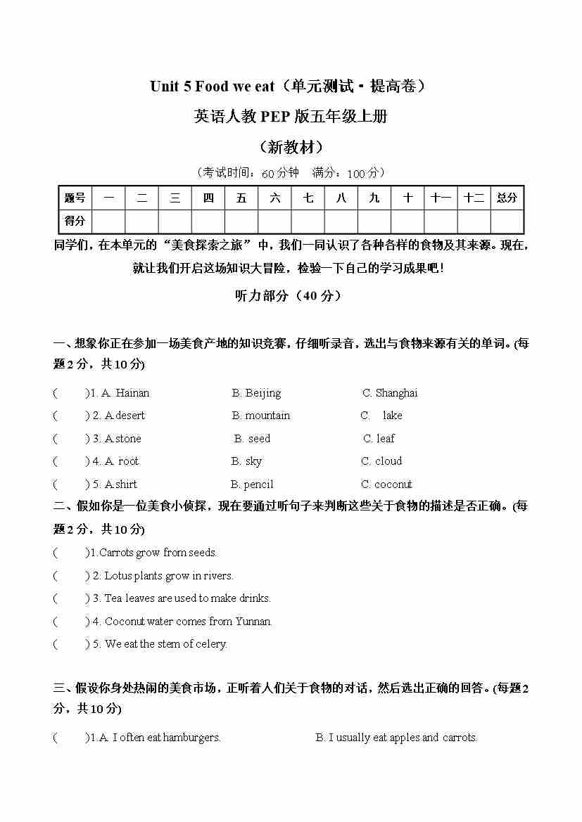 首页 > 全部 > 单元测试 > Unit 5 Food we eat(单元测试·提高卷)英语人教PEP版五年级上册(新教材)