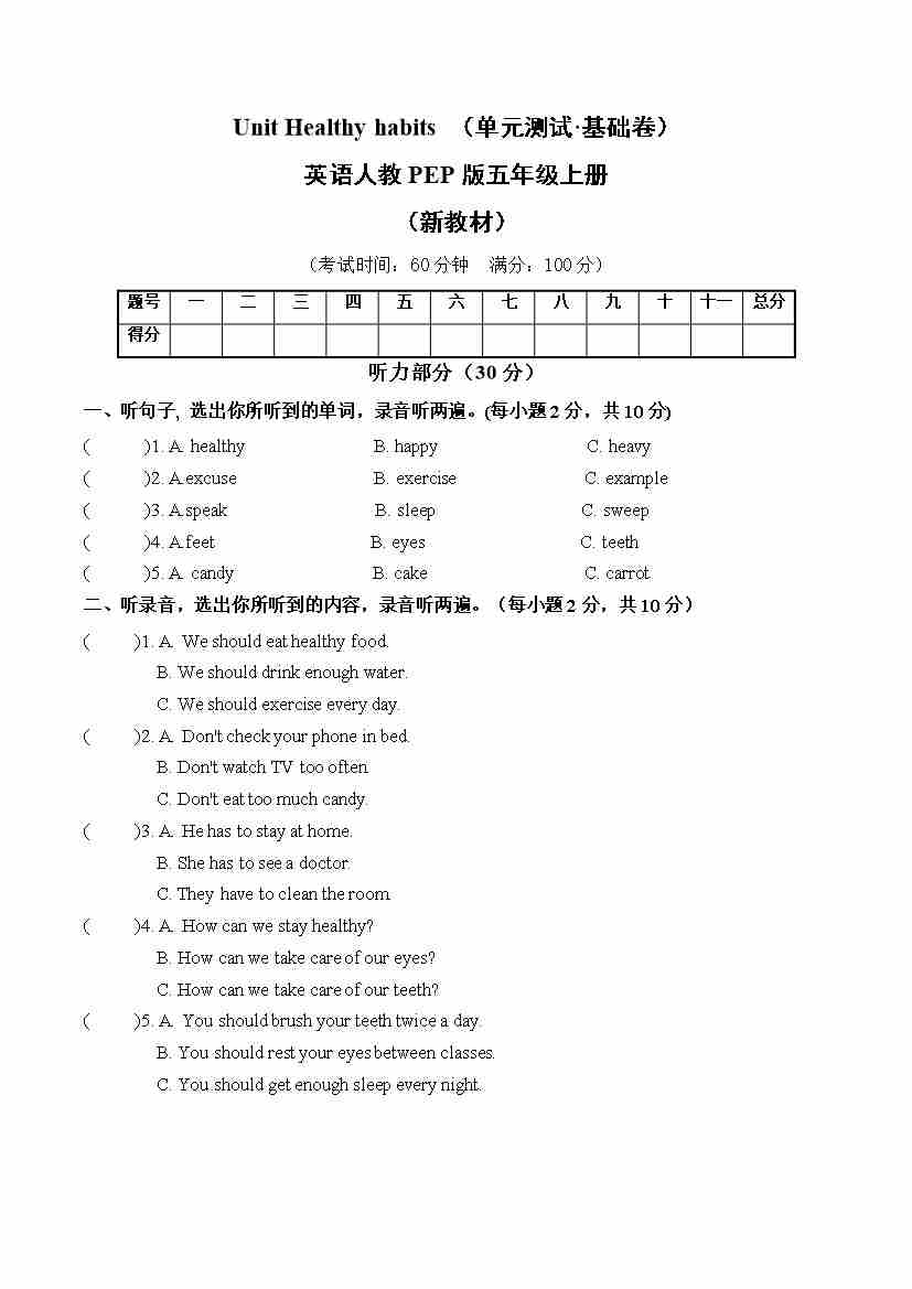首页 > 全部 > 单元测试 > Unit 4 Healthy habits(单元测试·基础卷)英语人教PEP版五年级上册(新教材)