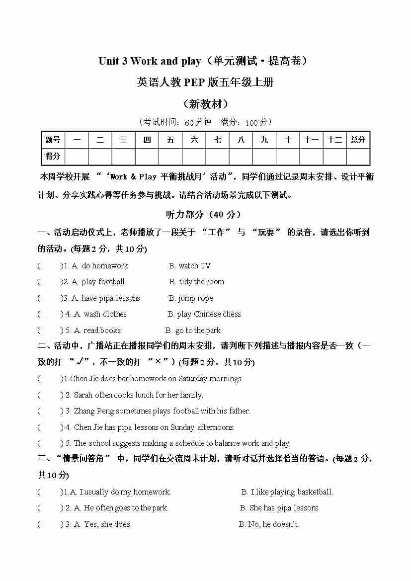 Unit 3 Work and play(单元测试·提高卷)英语人教PEP版五年级上册(新教材)