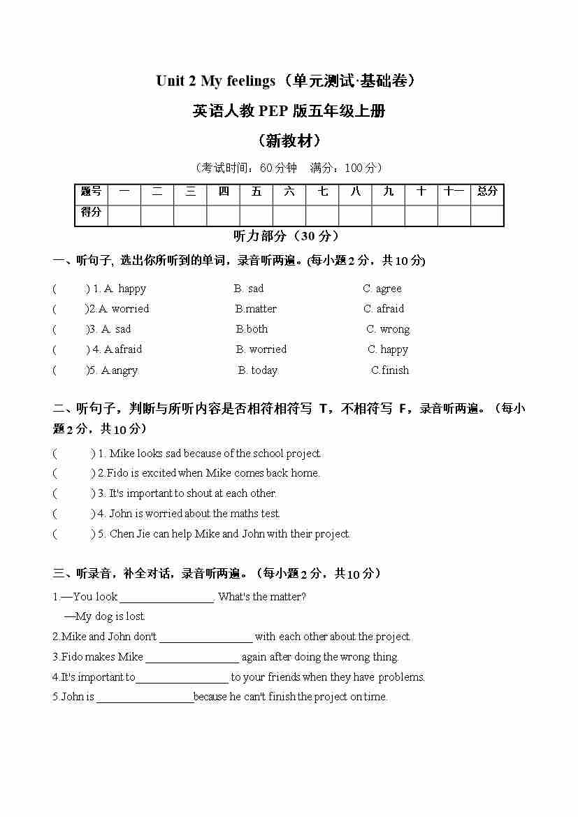 首页 > 全部 > 单元测试 > Unit 2 My feelings(单元测试·基础卷)英语人教PEP版五年级上册(新教材)