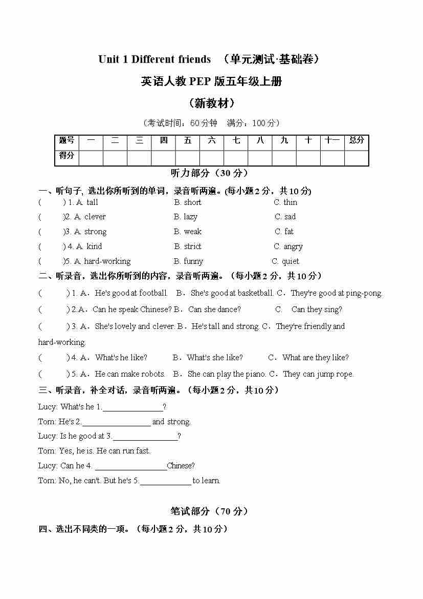 Unit 1 Different friends(单元测试·基础卷)英语人教PEP版五年级上册(新教材)