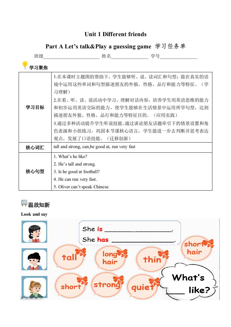 首页 > 全部 > 学习任务单 > Unit 1 第1课时 Part A Let’s talk&Play a guessing game(学习任务单) (新教材)