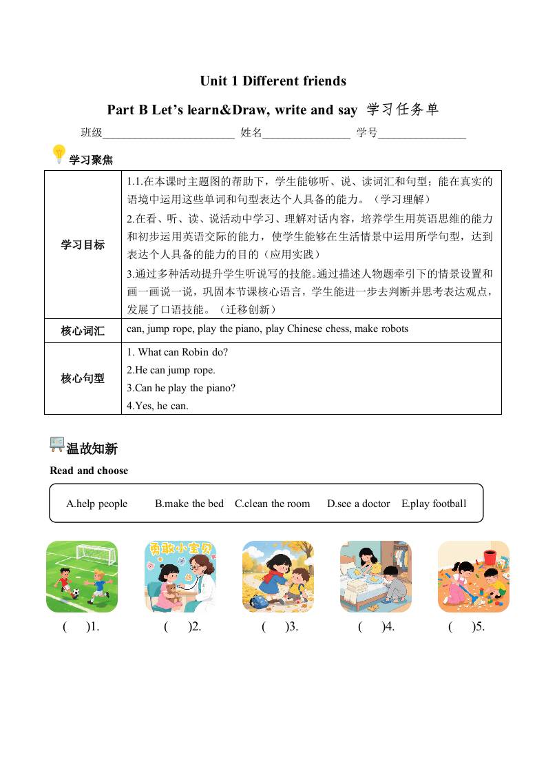 首页 > 全部 > 学习任务单 > Unit 1 第5课时 Part B Let’s learn&Draw, write and say(学习任务单) (新教材)