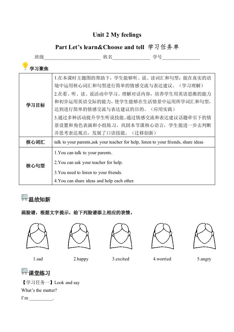 首页 > 全部 > 学习任务单 > Unit 2 第5课时 Part B Let’s learn&Choose and tell (学习任务单) (新教材)