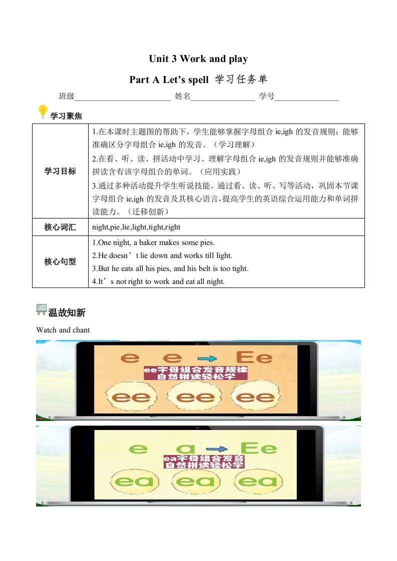 Unit 3 第3课时 Part A Let’s spell (学习任务单)(新教材)