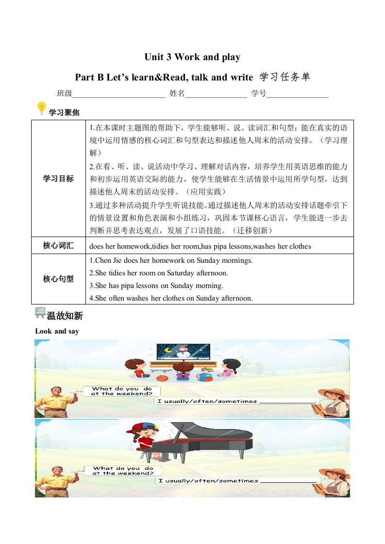 首页 > 全部 > 学习任务单 > Unit 3 第5课时 Part B Let’s learn&Read,talk and write (学习任务单)(新教材)