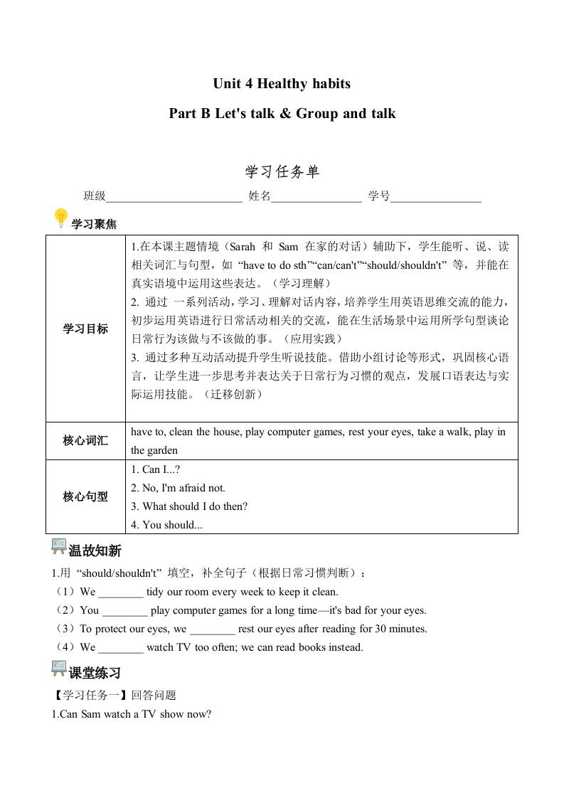 首页 > 全部 > 学习任务单 > Unit 4 第4课时 Part B Let's talk & Group and talk(学习任务单) (新教材)