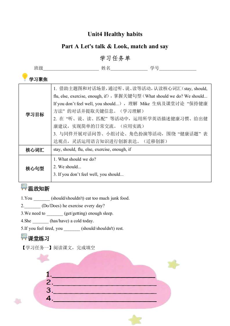 首页 > 全部 > 学习任务单 > Unit 4 第1课时 Part A Let's talk & Look, match and say (学习任务单) (新教材)
