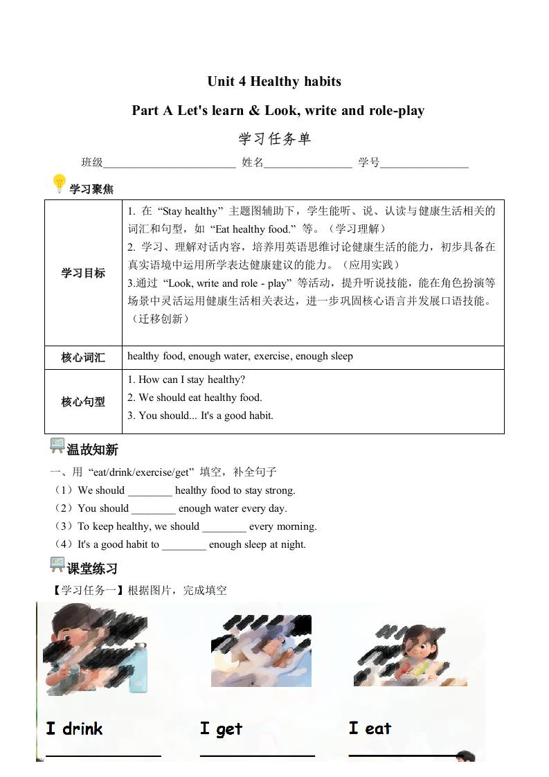 Unit 4 第2课时 Part A Let's learn & Look, write and role-play(学习任务单) (新教材)