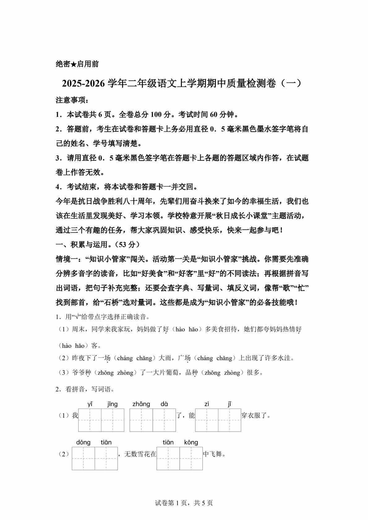 首页 > 全部 > 期中试卷 > 25年二年级上册语文期中素养测评·基础卷01(含答案14页)