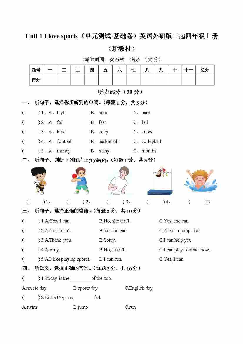 Unit 1 I love sports(单元测试·基础卷)英语外研版三起四年级上册(新教材)