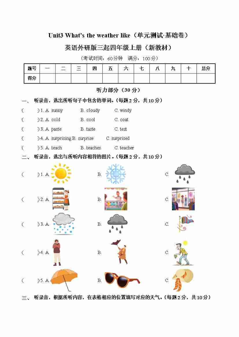 Unit 3 What’s the weather like(单元测试·基础卷)英语外研版三起四年级上册(新教材)