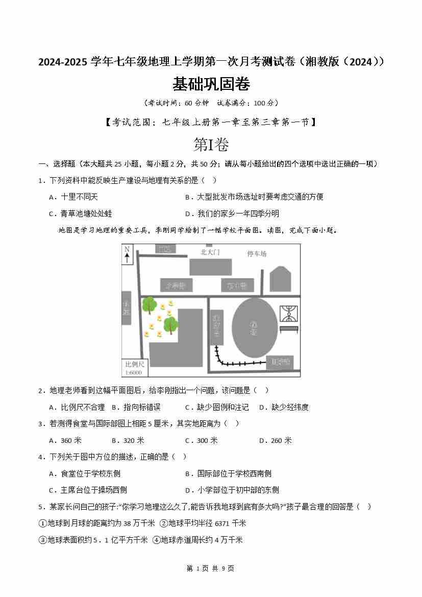 首页 > 全部 > 第一次月考 > 基础巩固卷-【分层卷·月考卷】2024-2025学年七年级地理上学期第一次月考测试卷(湘教版(2024))(原卷版)