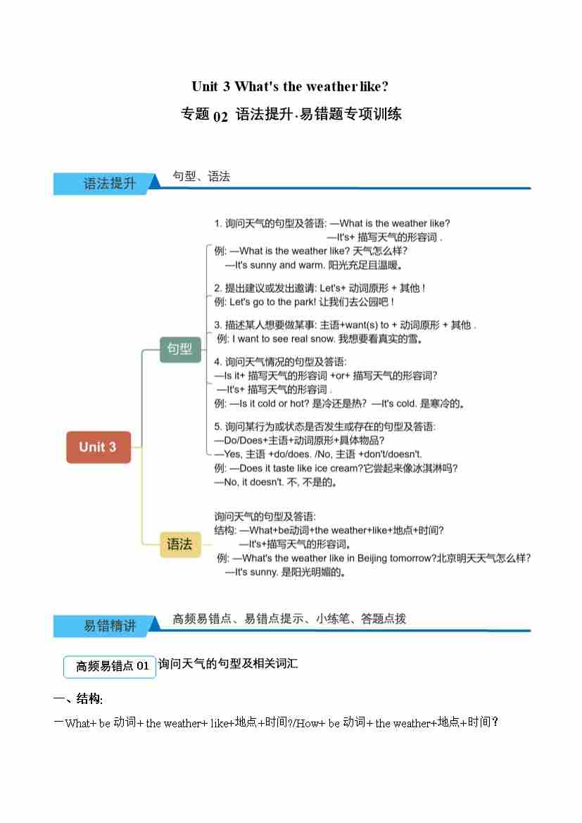 Unit 3 What's the weather like(易错题专项训练·语法提升)英语外研版三起四年级上册(新教材)