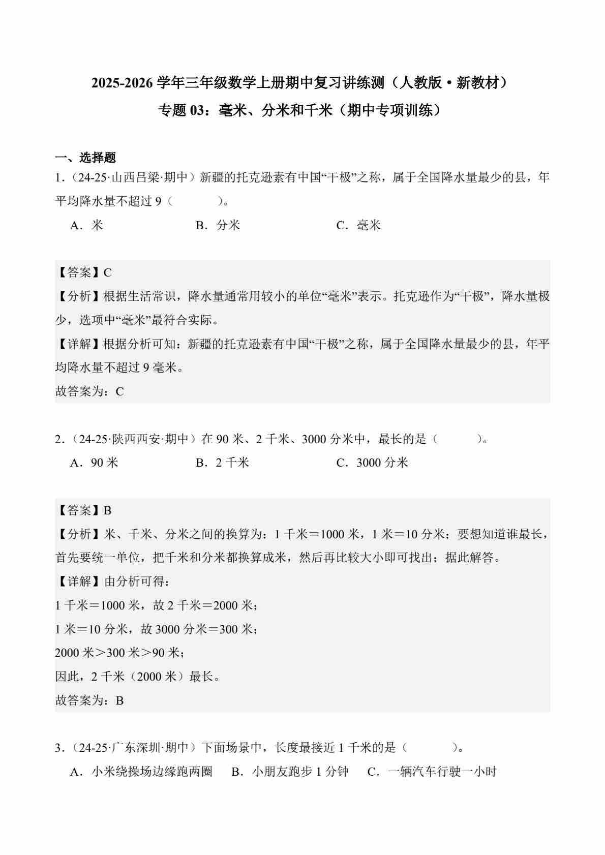首页 > 全部 > 期中专项 > 专题03:毫米、分米和千米(期中专项训练)三年级数学上册(人教版·新教材)(解析版)