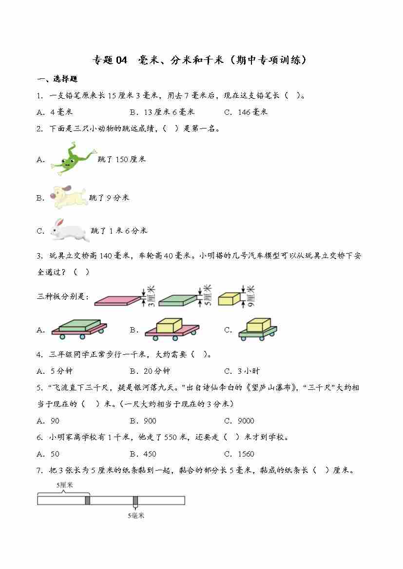 首页 > 全部 > 期中专项 > 专题04 毫米、分米和千米(期中专项训练)三年级数学上学期(原卷版)(苏教版•新教材)