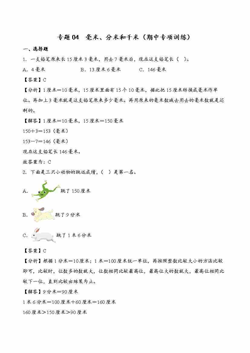 首页 > 全部 > 期中专项 > 专题04 毫米、分米和千米(期中专项训练)三年级数学上学期(解析版)(苏教版•新教材)