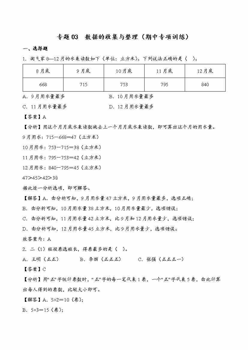 首页 > 全部 > 期中专项 > 专题03 数据的收集与整理(期中专项训练)三年级数学上学期(解析版)(苏教版•新教材)