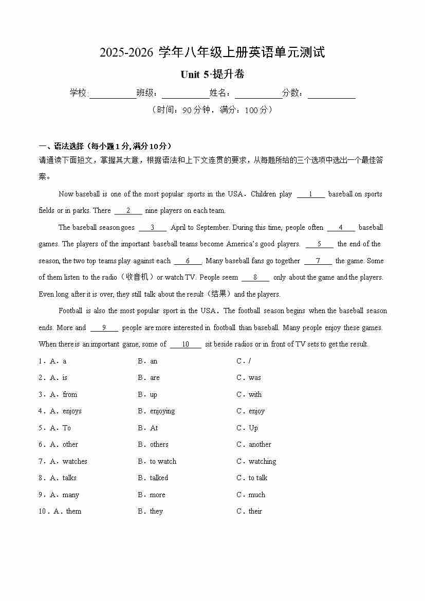 首页 > 全部 > 单元提升卷 > Unit 5 Teamwork(单元测试·提升卷)(原卷版)
