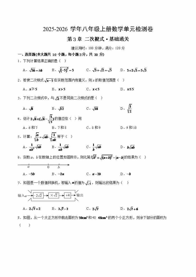第三章 二次根式(单元测试·基础卷)(考试版A4)