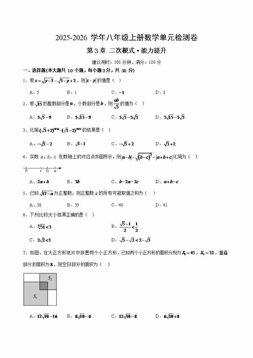 第3章 二次根式(单元测试·提升卷)(考试版A4)