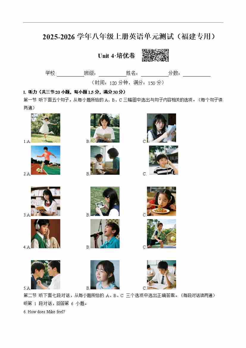 首页 > 全部 > 单元提升卷 > 八年级英语上册Unit 4 单元测试·福建专用(考试版A4)