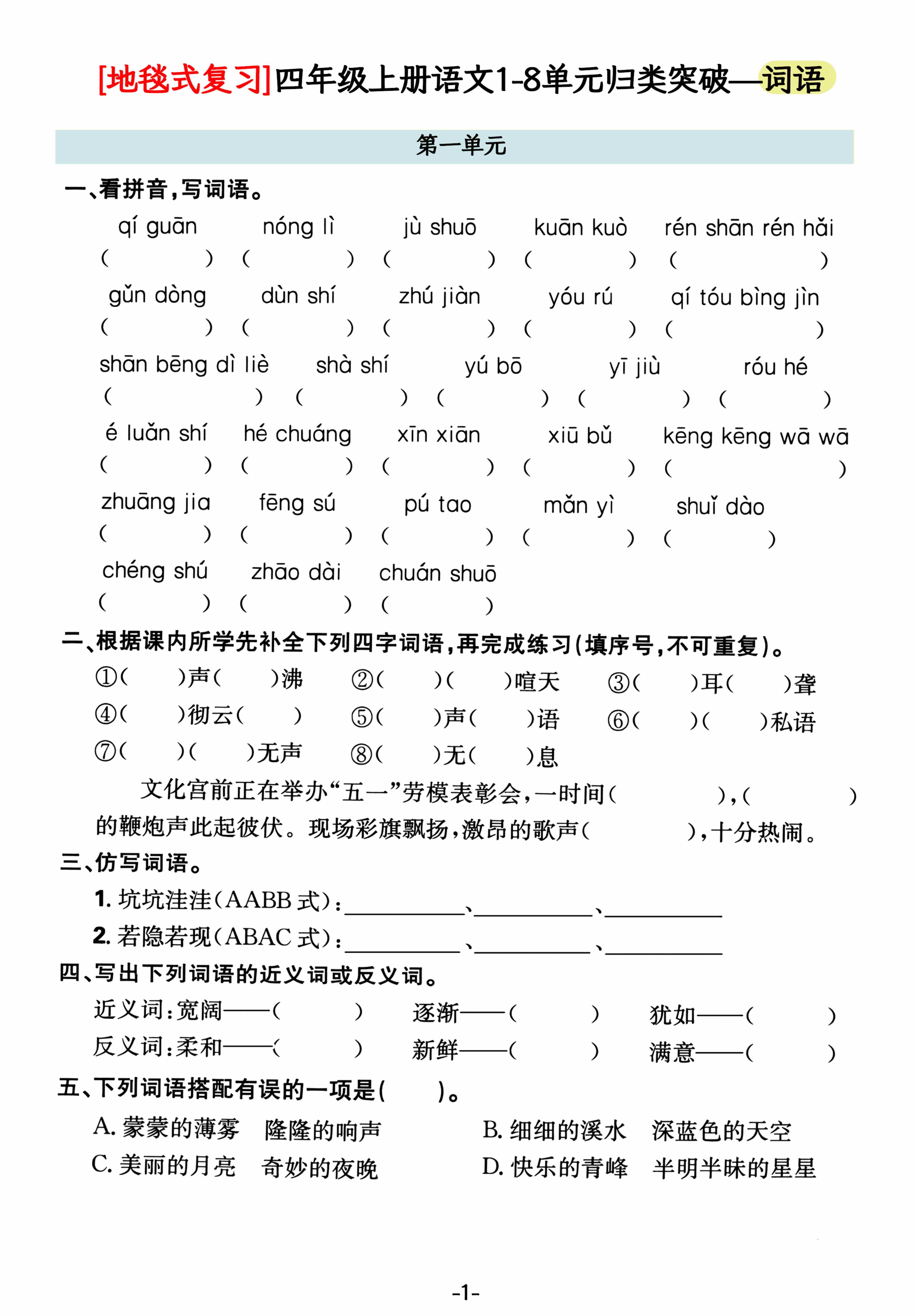【地毯式复习】四年级上册语文1-8单元归类突破——词语