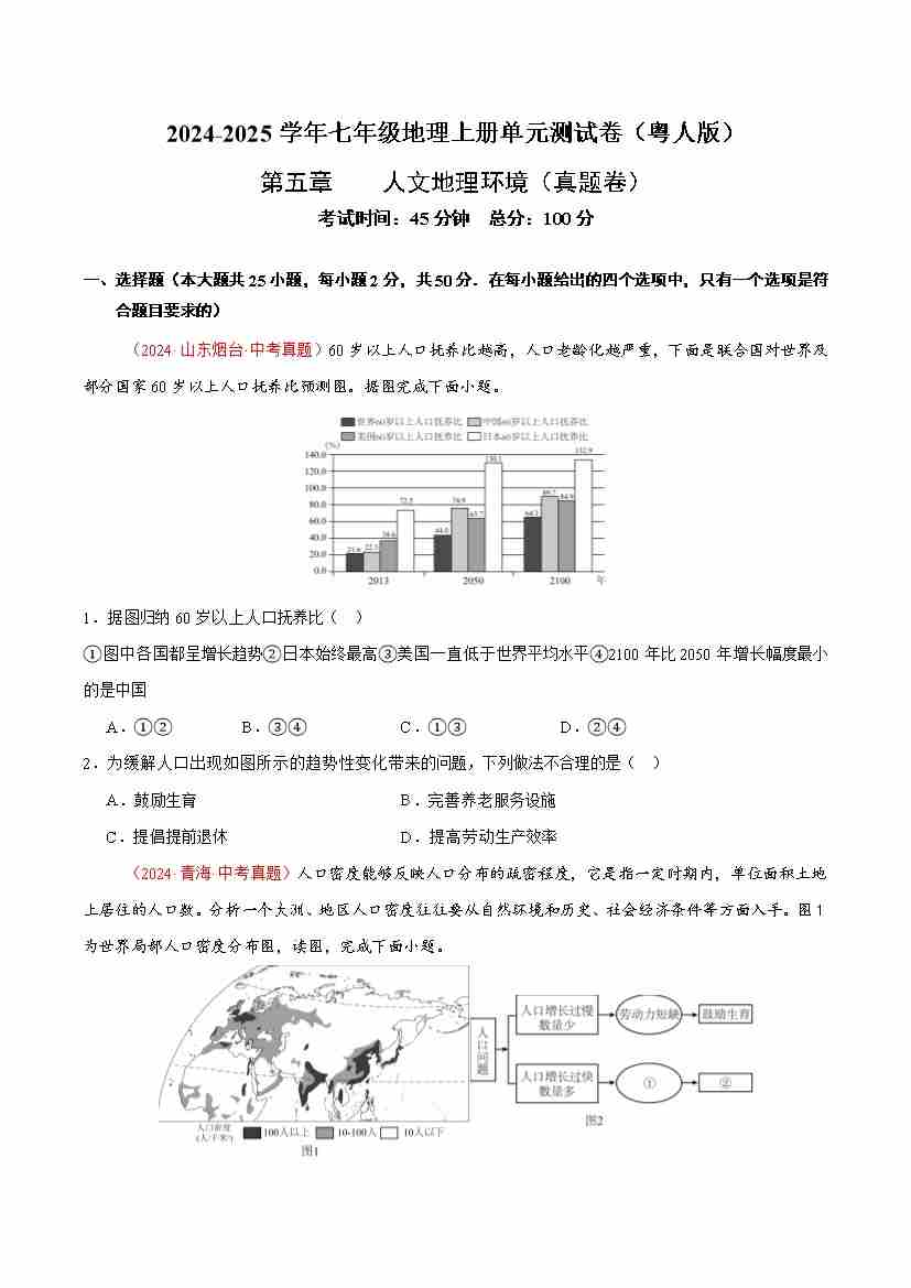 第五章 人文地理环境【B卷·真题卷】-2024-2025学年七年级地理上册单元速记·巧练(粤人版2024)(原卷版)
