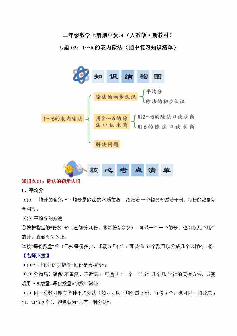 专题03:1~6的表内除法(期中知识清单)二年级数学上册(人教版·新教材)(学生版)