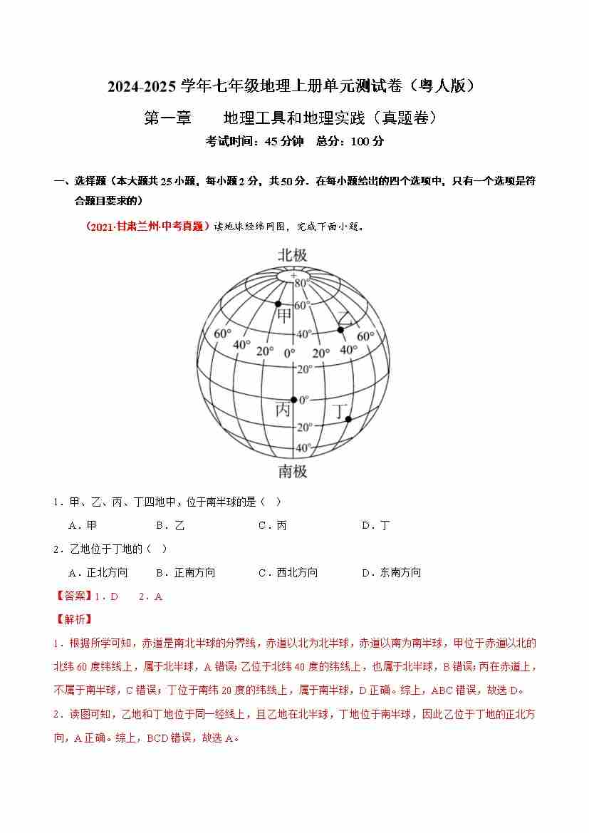 首页 > 全部 > 单元真题卷 > 第一章 地理工具和地理实践【B卷·真题卷】-2024-2025学年七年级地理上册单元速记·巧练(粤人版2024)(解析版)