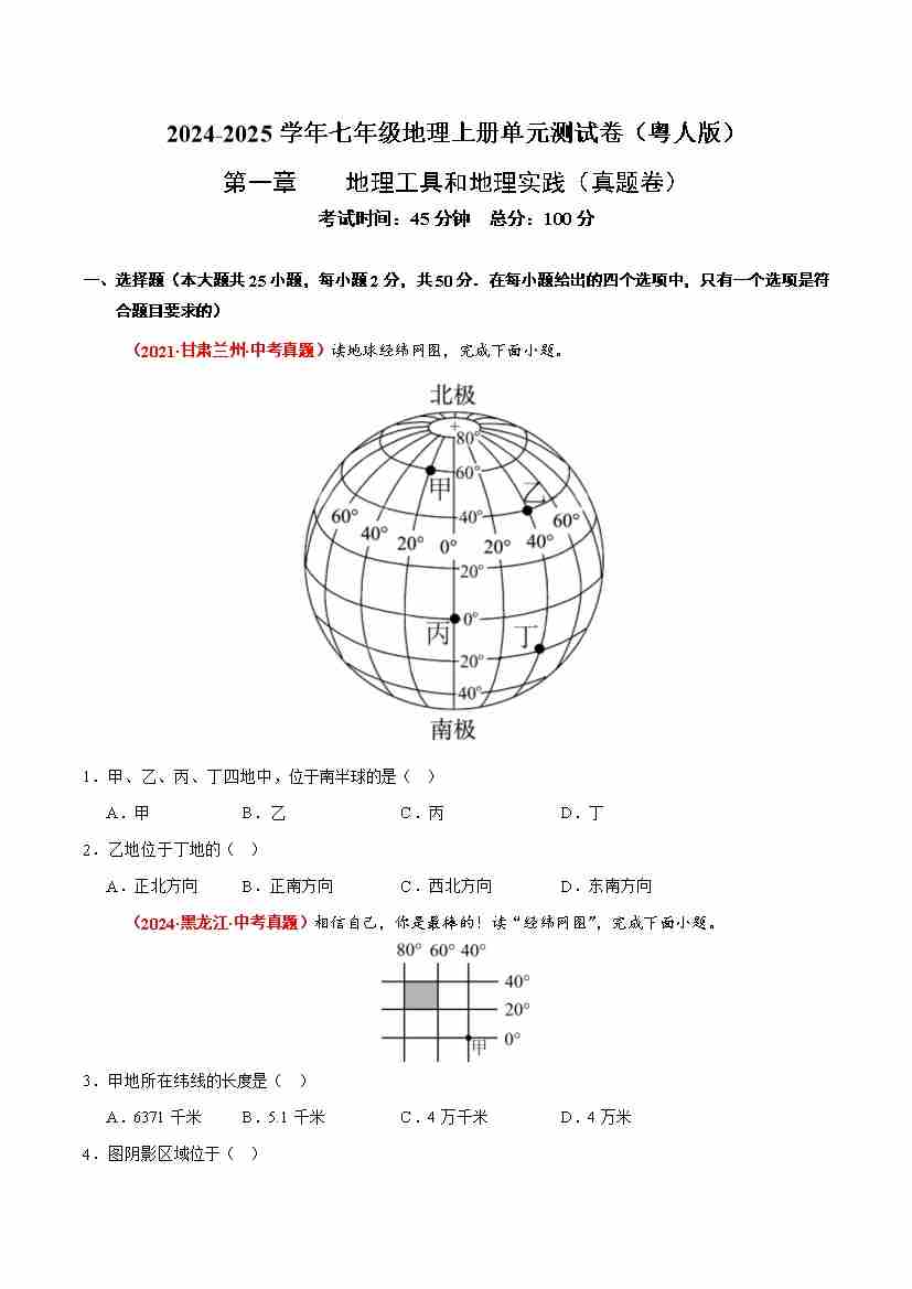 第一章 地理工具和地理实践【B卷·真题卷】-2024-2025学年七年级地理上册单元速记·巧练(粤人版2024)(原卷版)