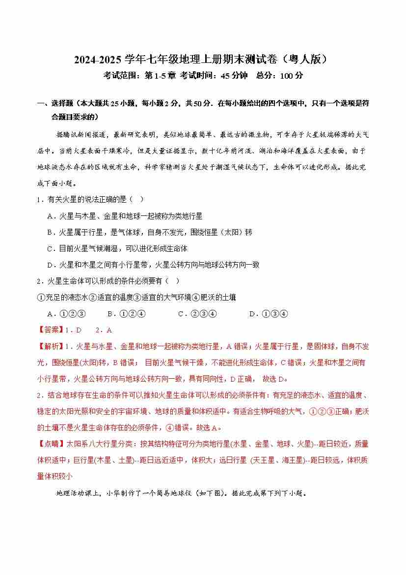 首页 > 全部 > 期末试卷 > 期末测试卷(1-5章)-2024-2025学年七年级地理上册单元速记·巧练(粤人版2024)(解析版)