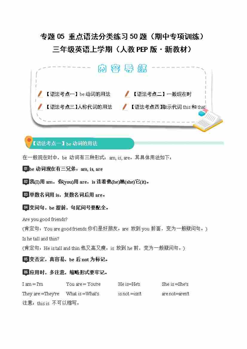 首页 > 全部 > 期中专项 > 专题05 重点语法分类练习(期中专项训练)三年级英语上学期(人教PEP版·新教材)