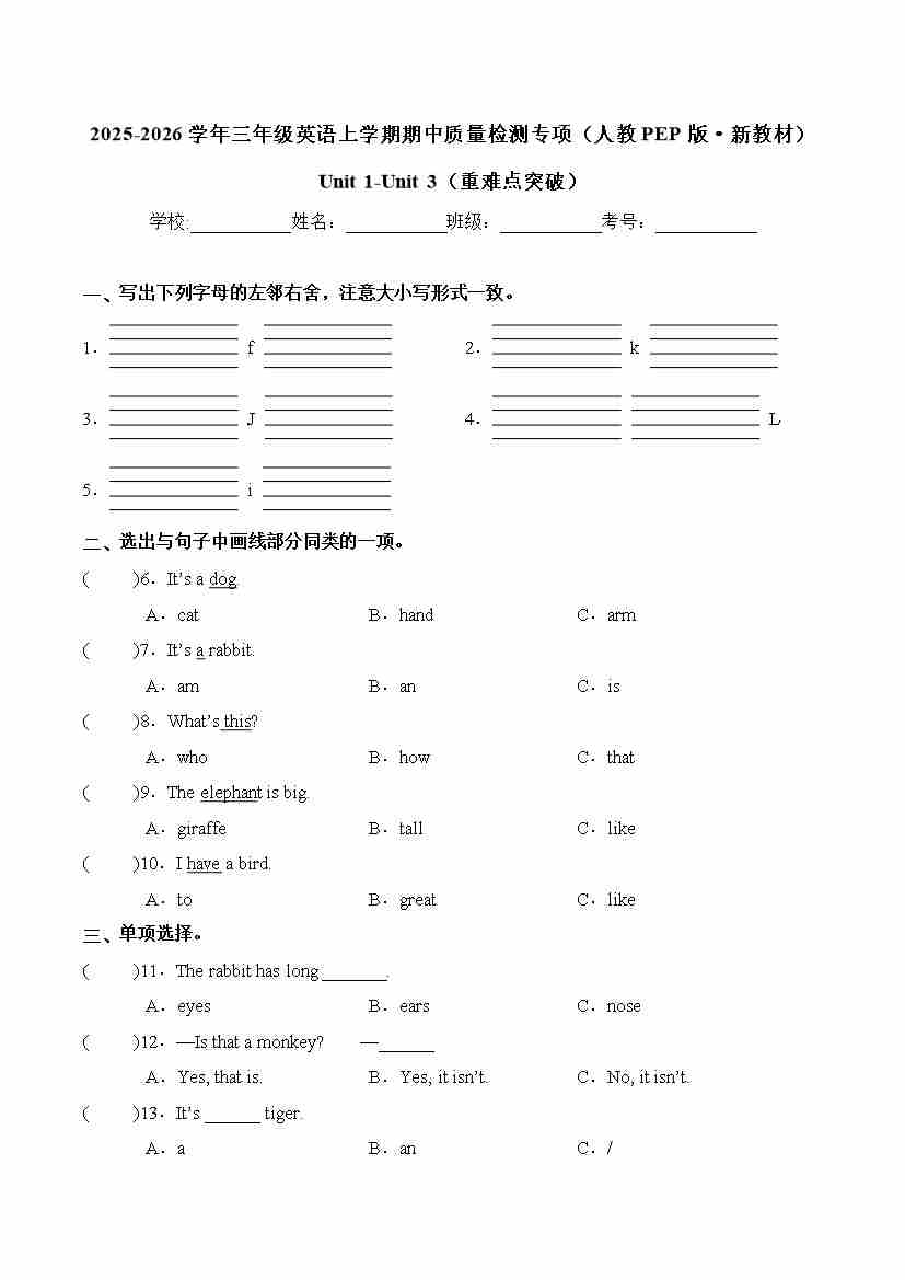 首页 > 全部 > 期中专项 > Unit 1-Unit 3(重难点突破)-2025-2026学年三年级英语上学期期中质量检测专项(人教PEP版·新教材)