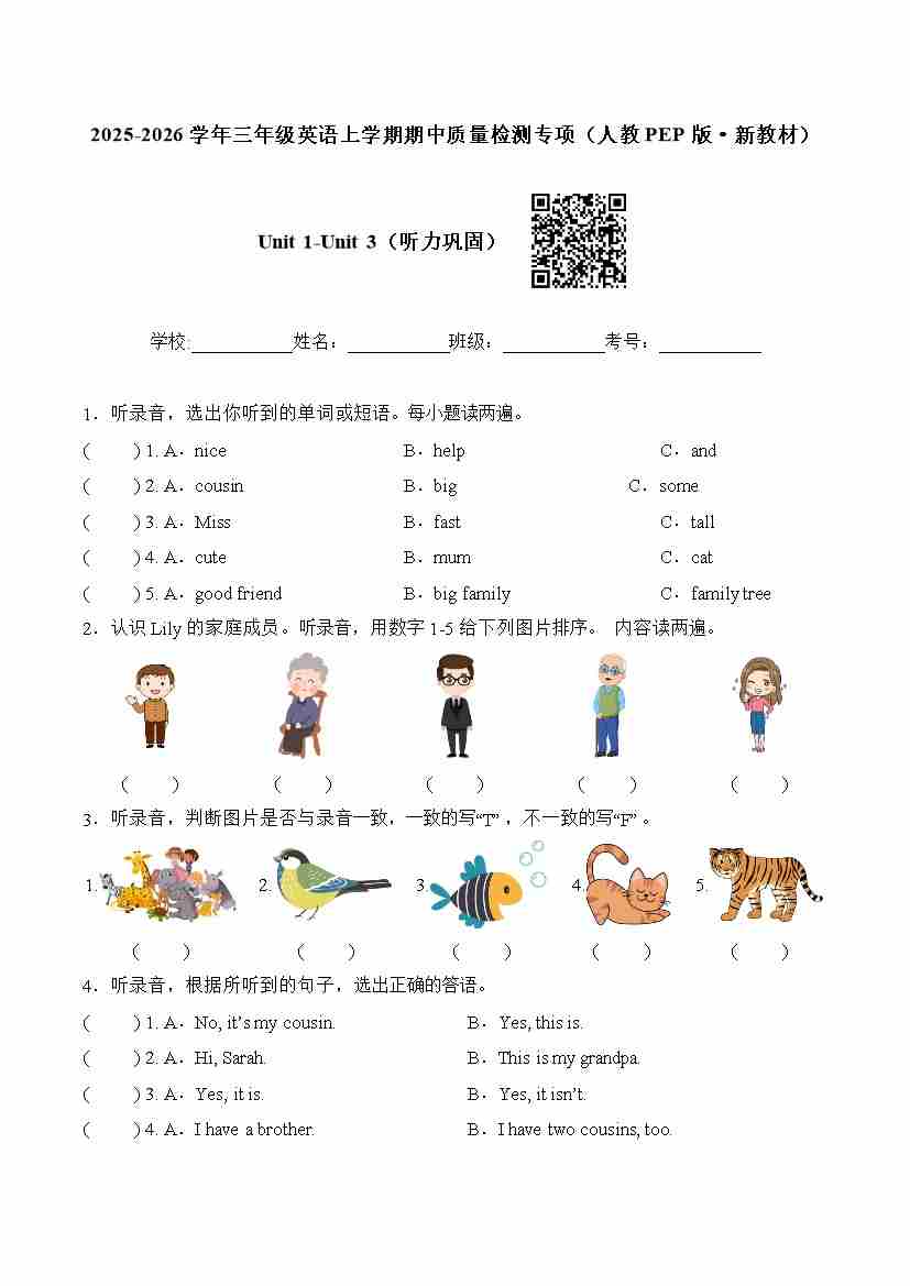 首页 > 全部 > 期中专项 > Unit 1-Unit 3(听力巩固)-2025-2026学年三年级英语上学期期中质量检测专项(人教PEP版·新教材)