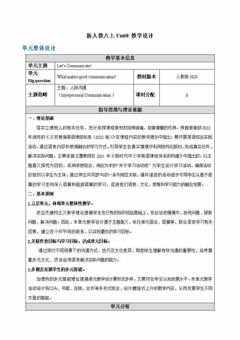 首页 > 全部 > 课件教案 > Unit8 Let’s Communicate!教学设计(表格式,6课时)人教版(2024)八年级上册