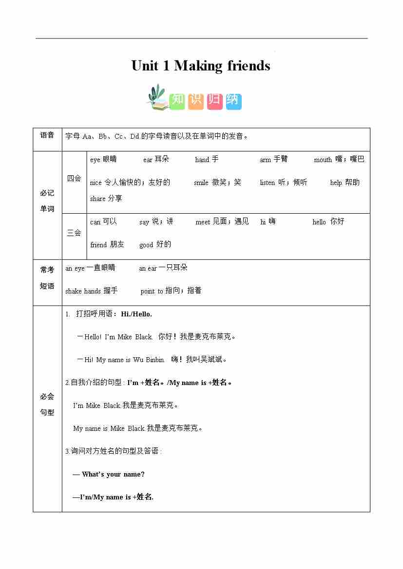 首页 > 全部 > 知识清单 > Unit 1(知识清单) -2024-2025学年英语三年级上册单元速记·巧练系列(人教PEP版·2024秋)