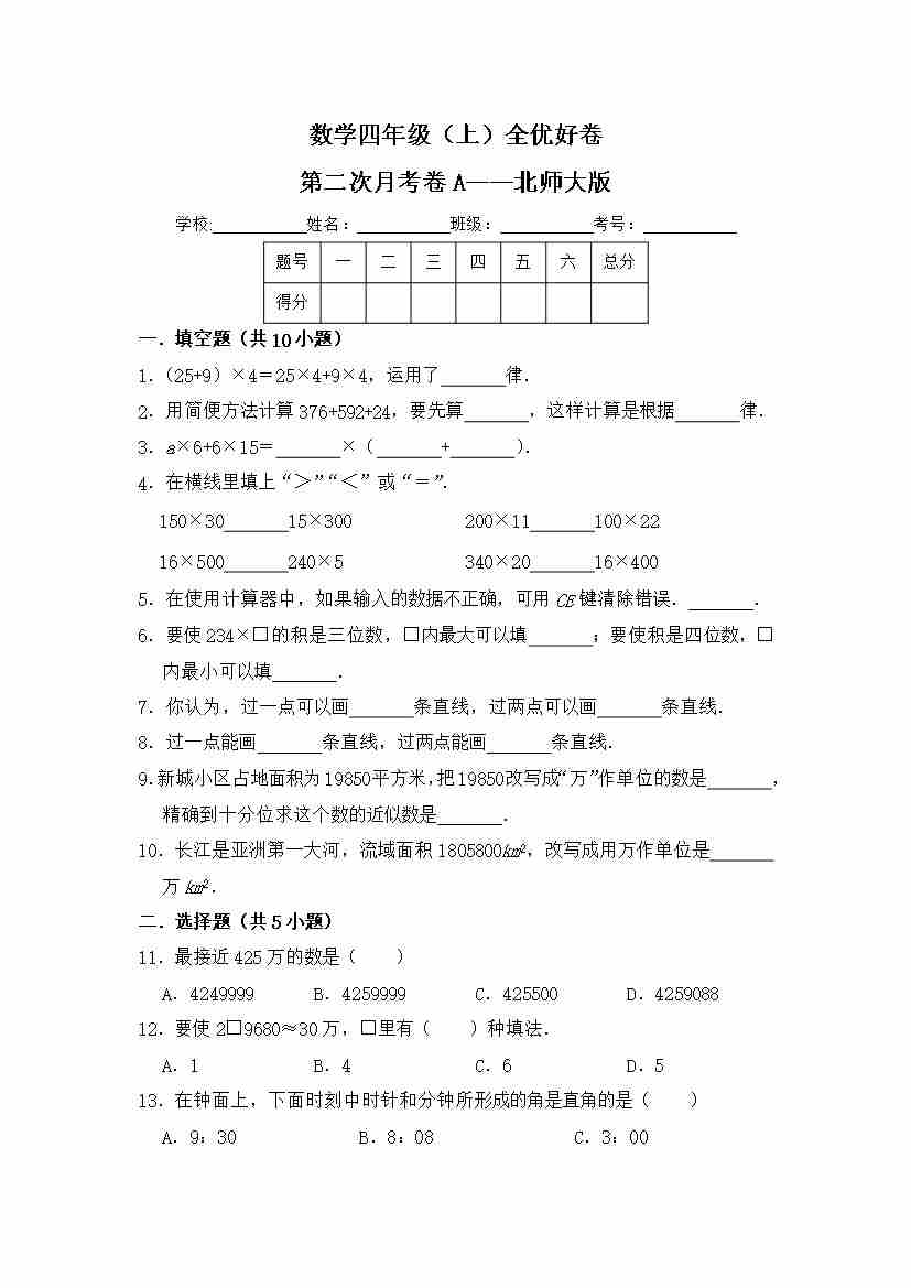 首页 > 全部 > 月考试卷 > 【月考】第二次月考卷a——北师大版(含答案)