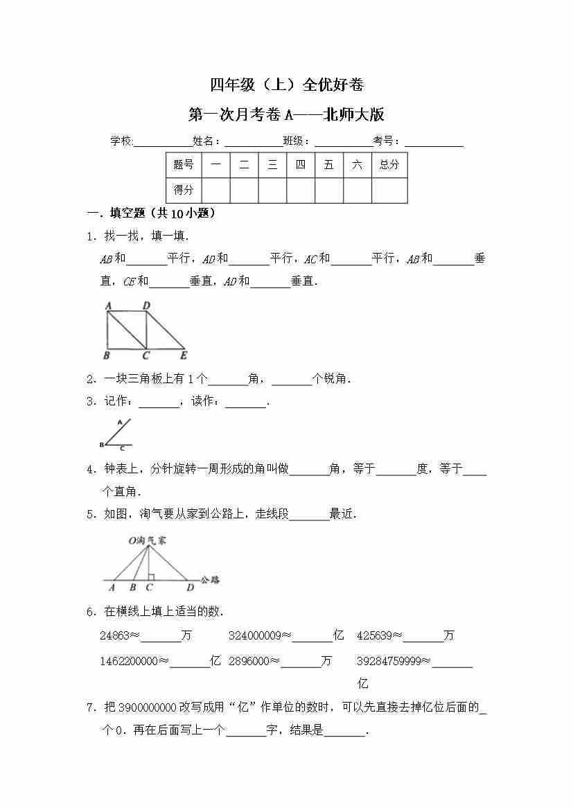 首页 > 全部 > 月考试卷 > 【月考】第一次月考卷a——北师大版(含答案)