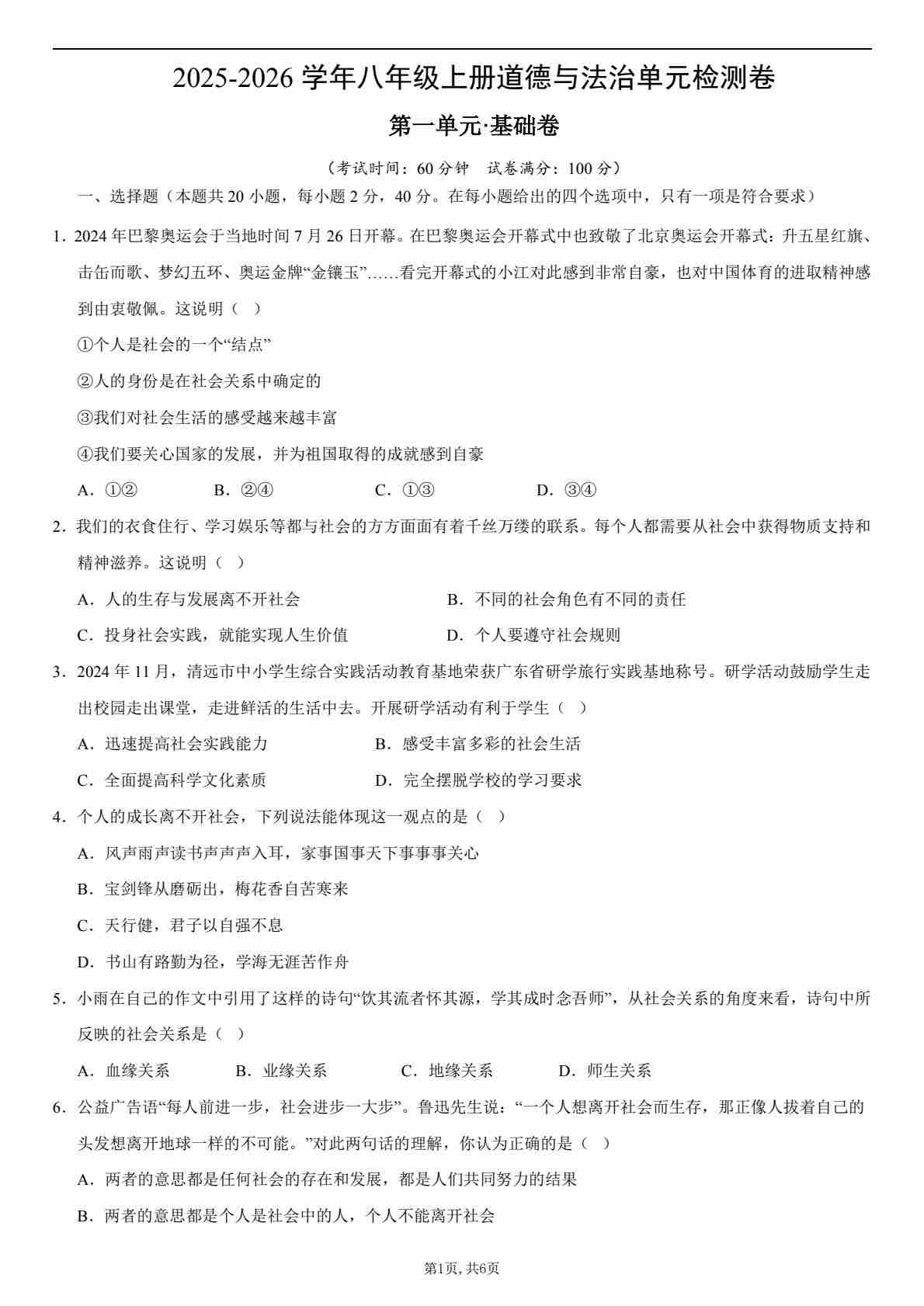 首页 > 全部 > 单元测试 > 【八上道法】第一单元测试·基础卷(考试版A4)