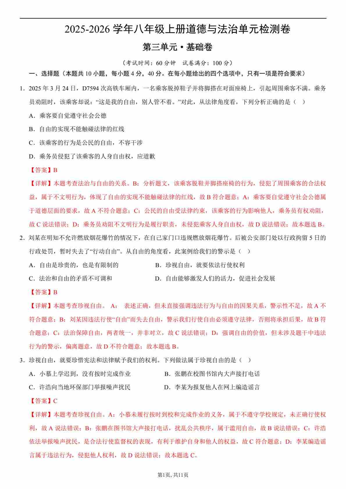 首页 > 全部 > 单元测试 > 【八上道法】第三单元测试·基础卷(解析版)