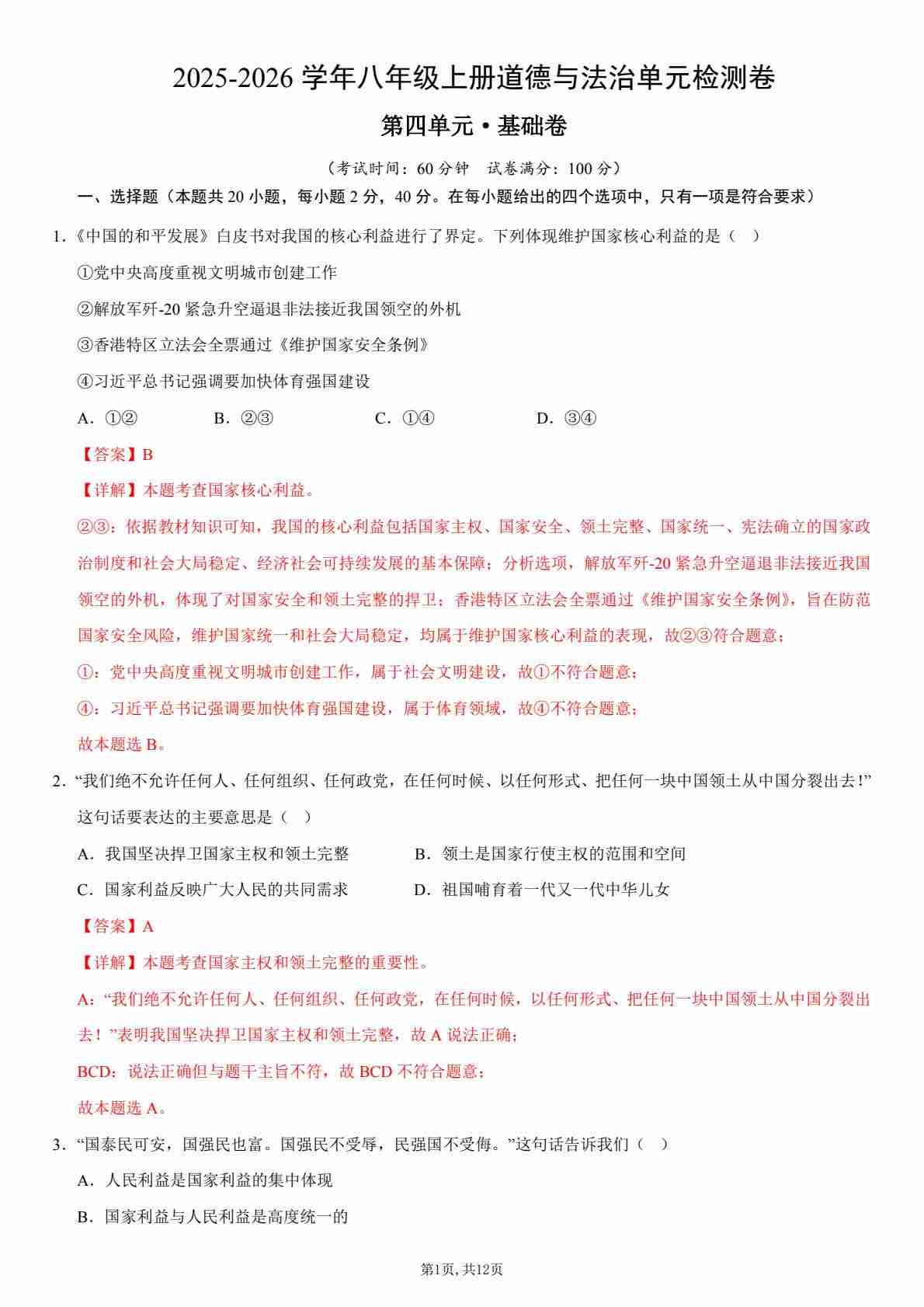首页 > 全部 > 单元测试 > 【八上道法】第四单元测试·基础卷(解析版)
