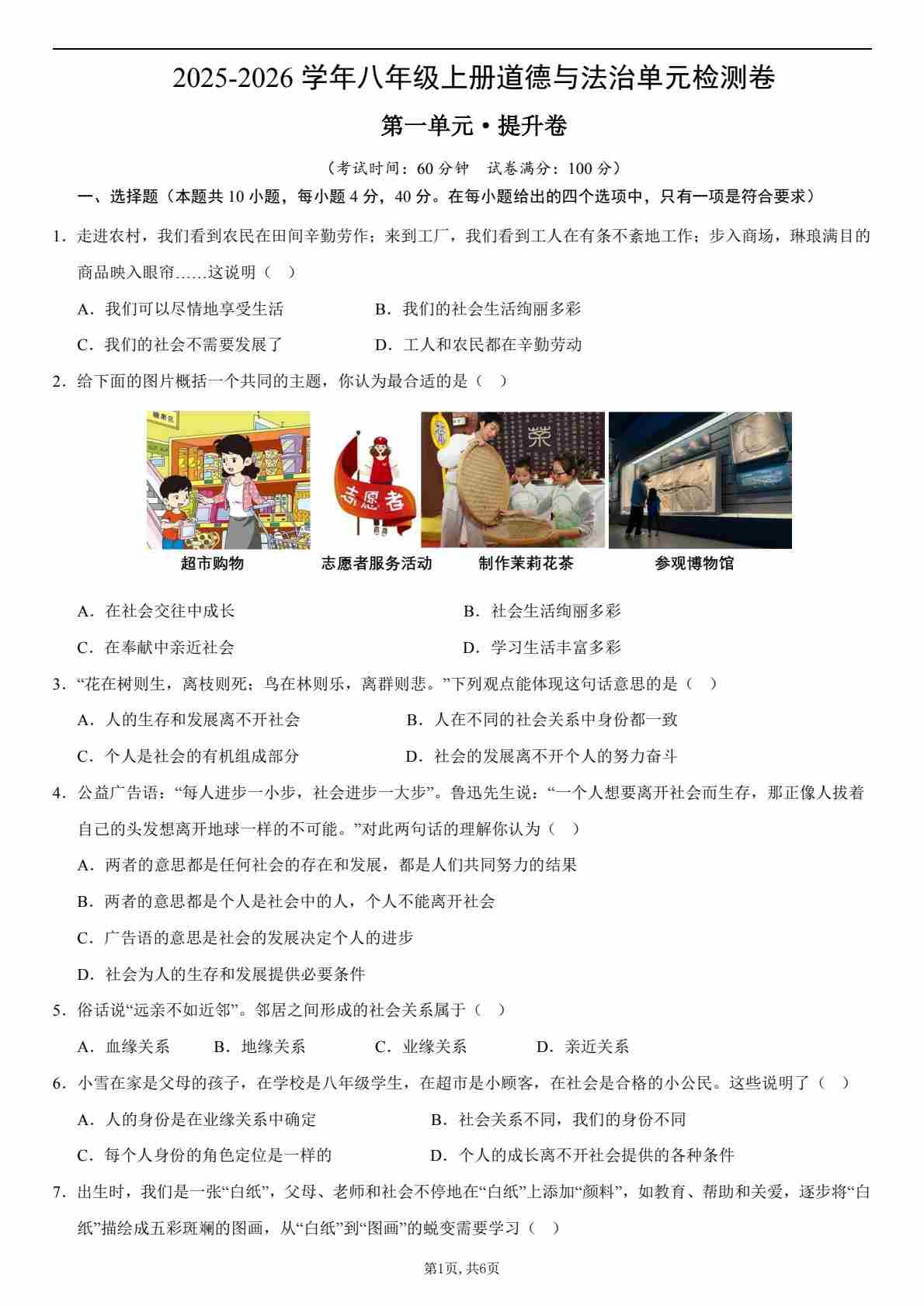 首页 > 全部 > 单元测试 > 【八上道法】第一单元测试·提升卷(考试版A4)