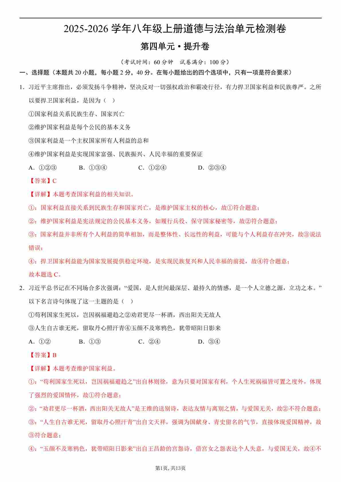 首页 > 全部 > 单元测试 > 【八上道法】第四单元测试·提升卷(解析版)
