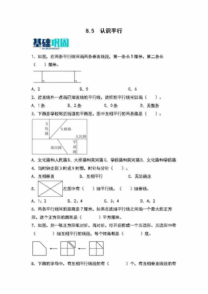 8.5  认识平行 同步分层作业(学生版)(苏教版)