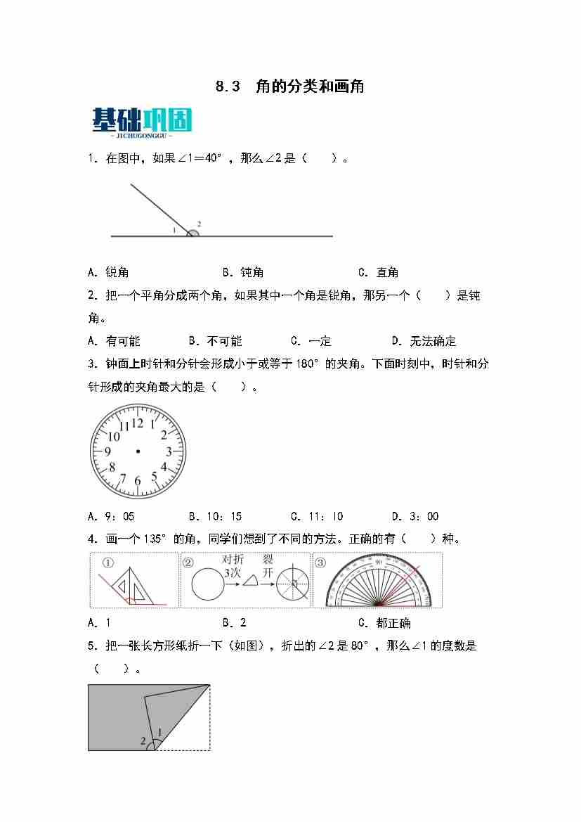 8.3  角的分类和画角 同步分层作业(学生版)(苏教版)