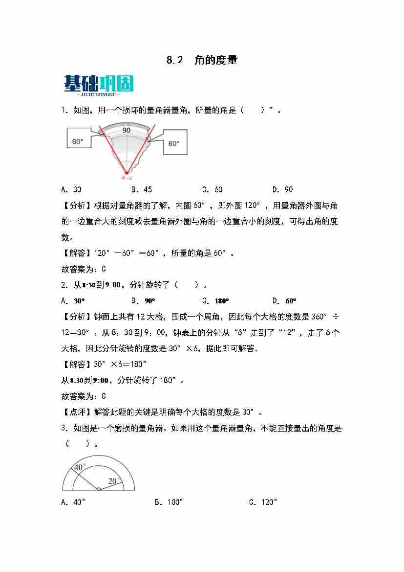 8.2  角的度量 同步分层作业(教师版)(苏教版)