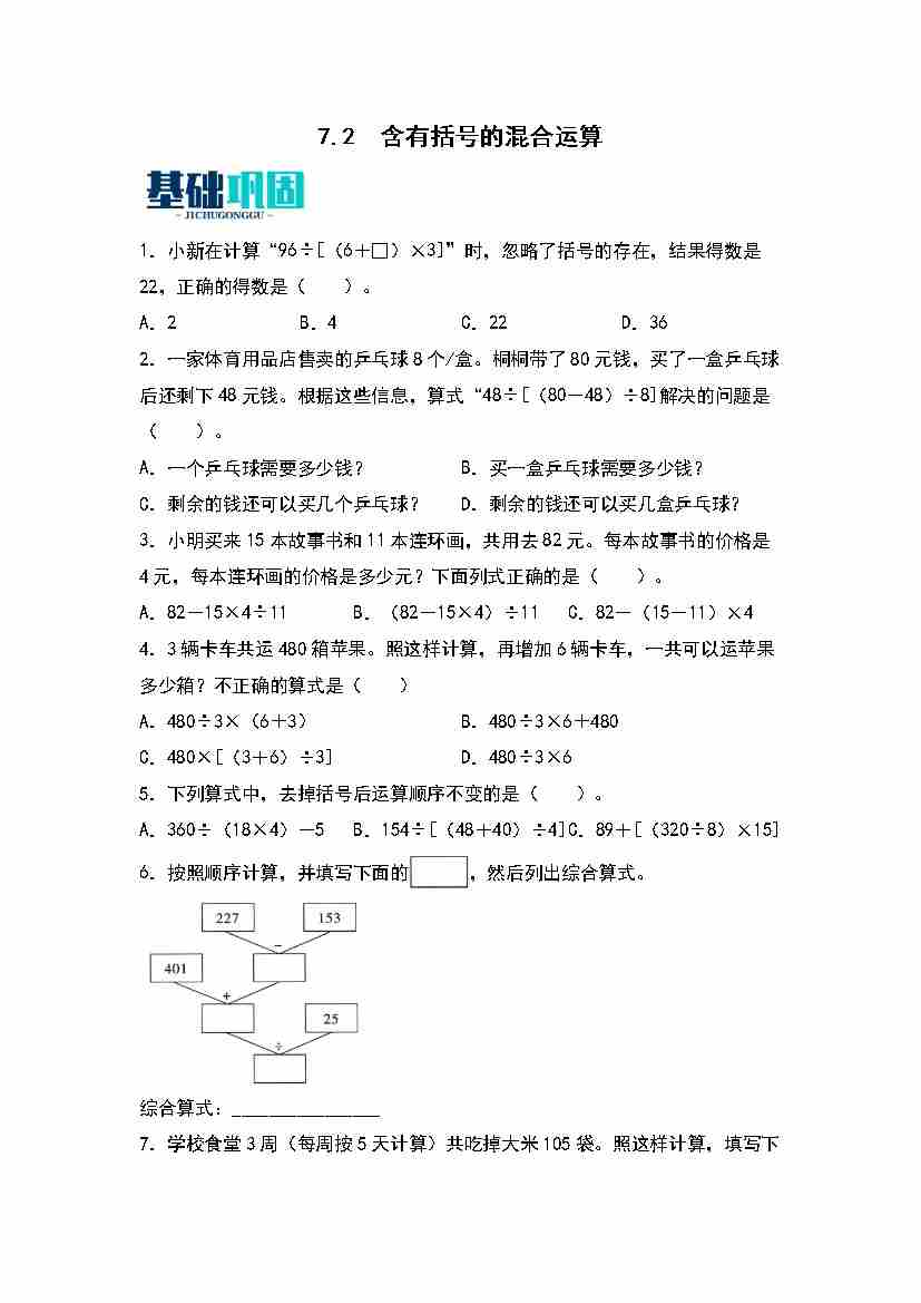 7.2  含有括号的混合运算 同步分层作业(学生版)(苏教版)