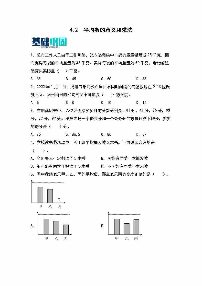 首页 > 全部 > 分层作业 > 4.2  平均数的意义和求法 同步分层作业(学生版)(苏教版)